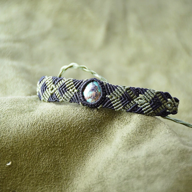 دستبند بافته شده با نخ ابریشمی موم خورده و سنگ فیروزه نیشابور بند کشوییی وقابل تنظیم میباشد