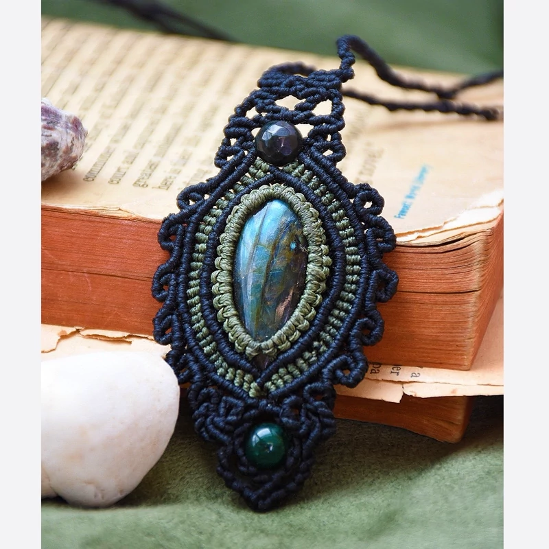 گردنبند سنگ لابرادوریت با تلولو سبز آبی بافته شده با نخ ابریشمی موم خورده و بند قابل تنظیم