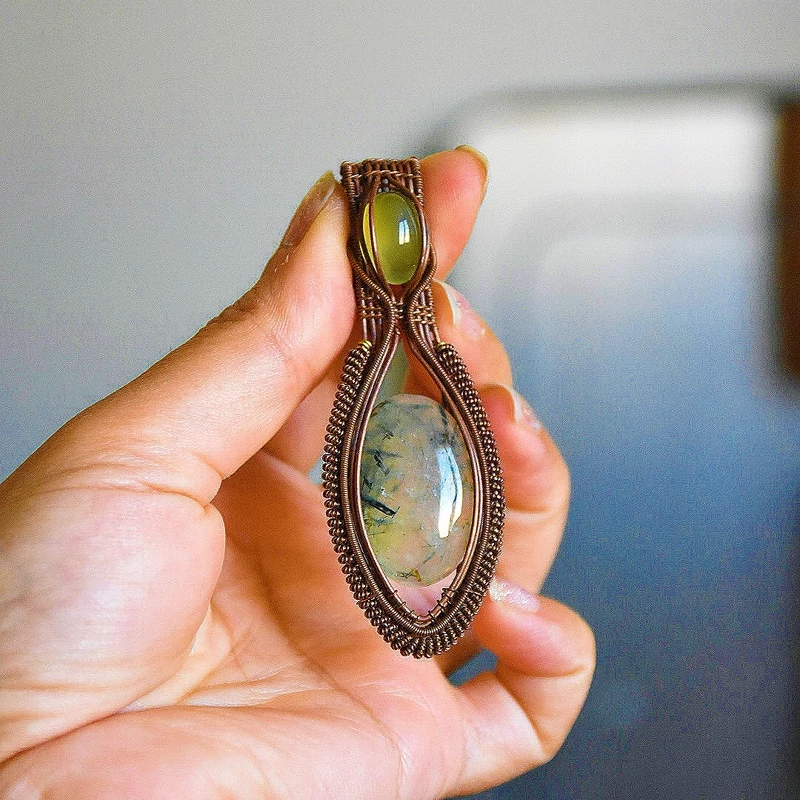 گردنبند ساخته شده با فلز مس سنگ بالای کار عقیق و سنگ پایین سنگ پرهنیت میباشد تمام کار با مس ساخته شده و تماما کار دست میباشد و یکار منحصر بفرد و خاص برای شما طراحی شده