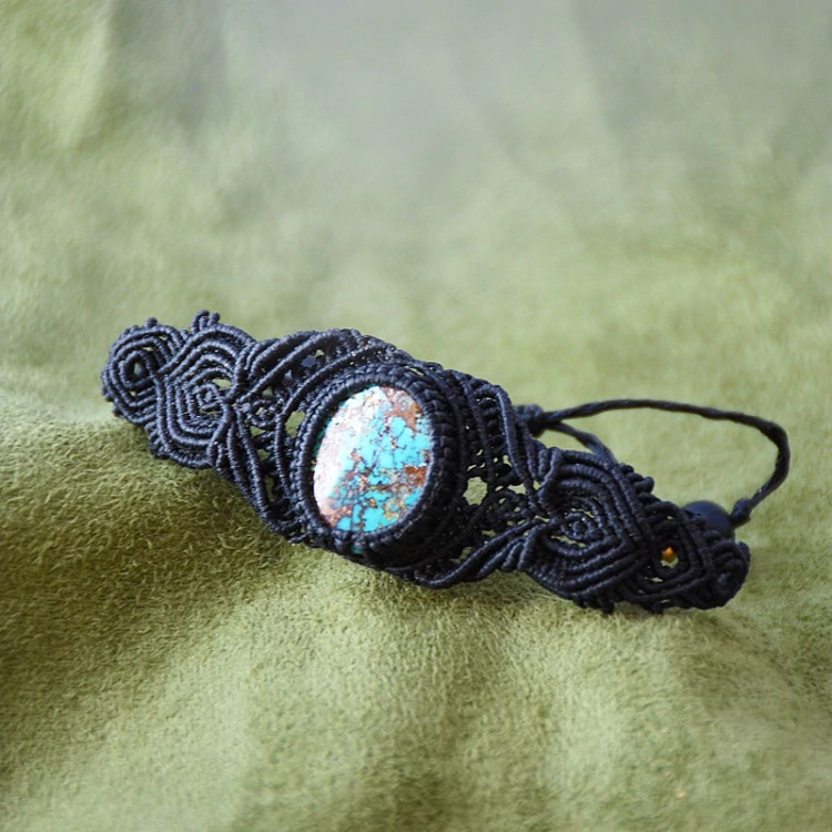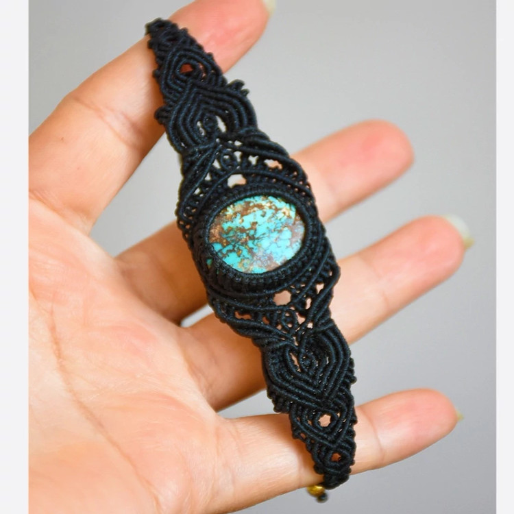 دستبند بافته شده با نخ ابریشمی موم خورده سنگ کار فیروزه نیشابور با بند کشویی قابل تنظیم