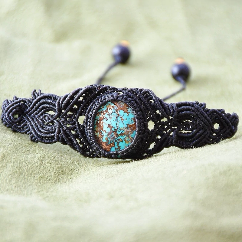 دستبند بافته شده با نخ ابریشمی موم خورده سنگ کار فیروزه نیشابور با بند کشویی قابل تنظیم