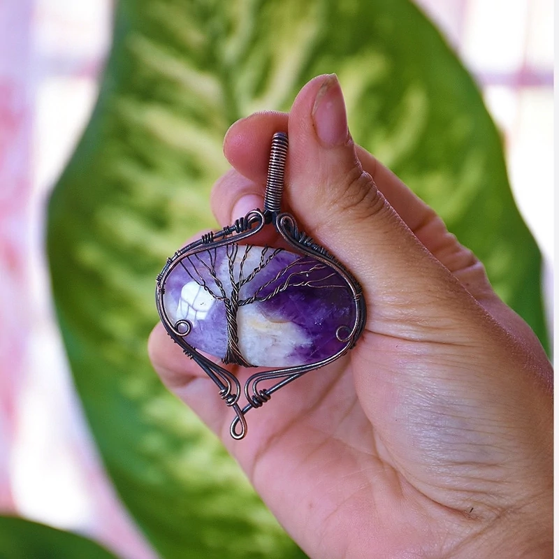 گردنبند ساخته شده با فلز مس و سنگ آمیتیس طبیعی و معدنی چشم نواز به همراه بند چرمی