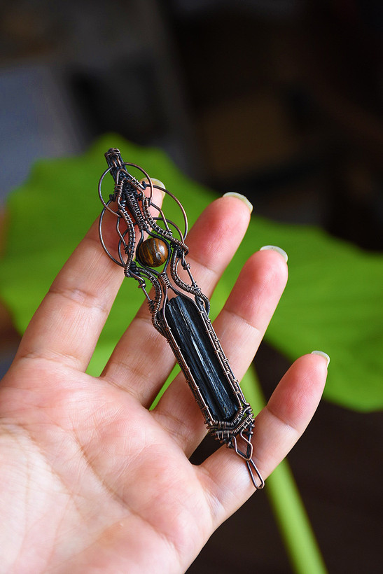 گردنبند ساخته شده با سنگ تورمالین سیاه و چشم ببر طبیعی و معدنی یک کار بسیار خاص و شیک ساخته شده تماما با هنر دست و فلز مس به همراه بند چرمی