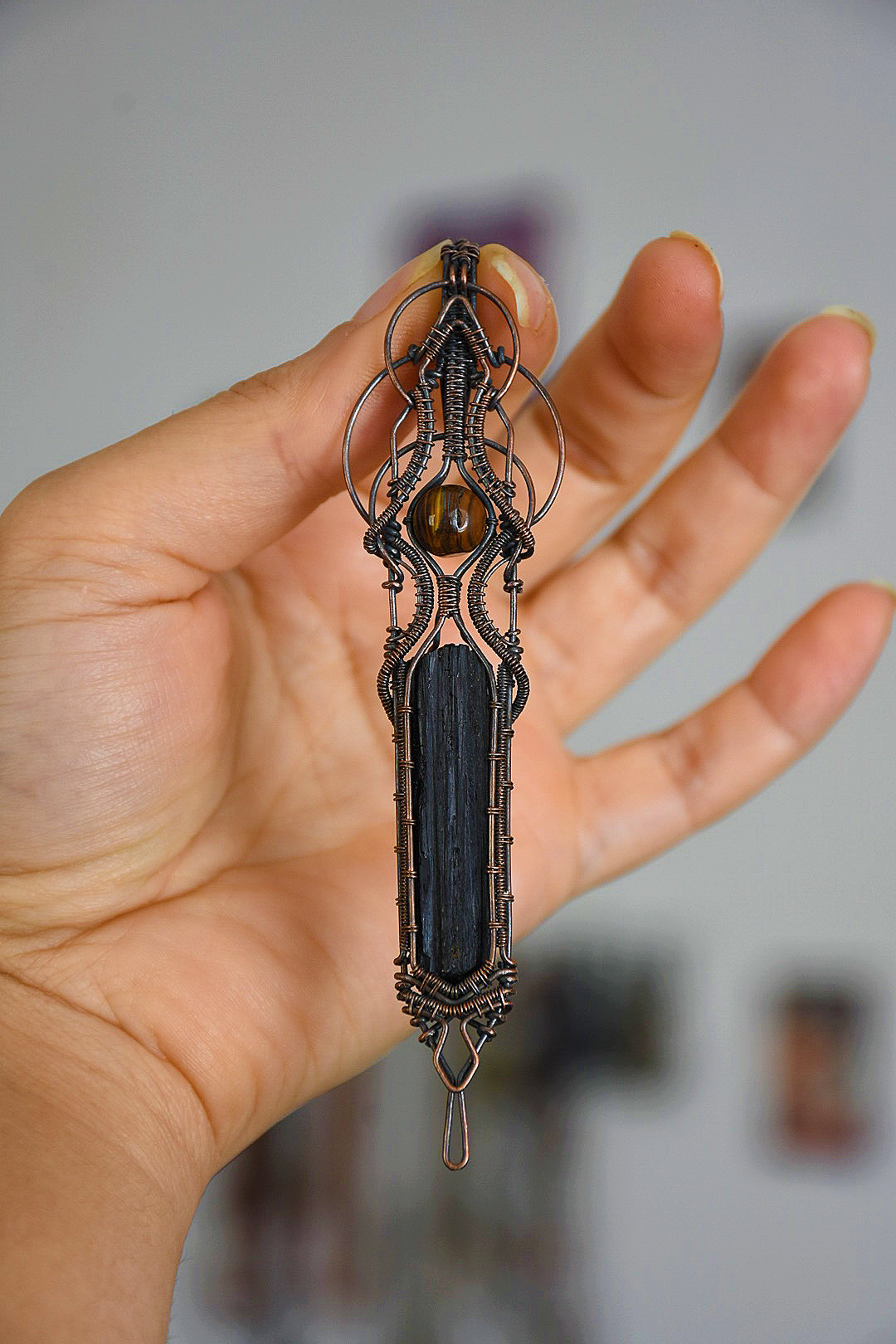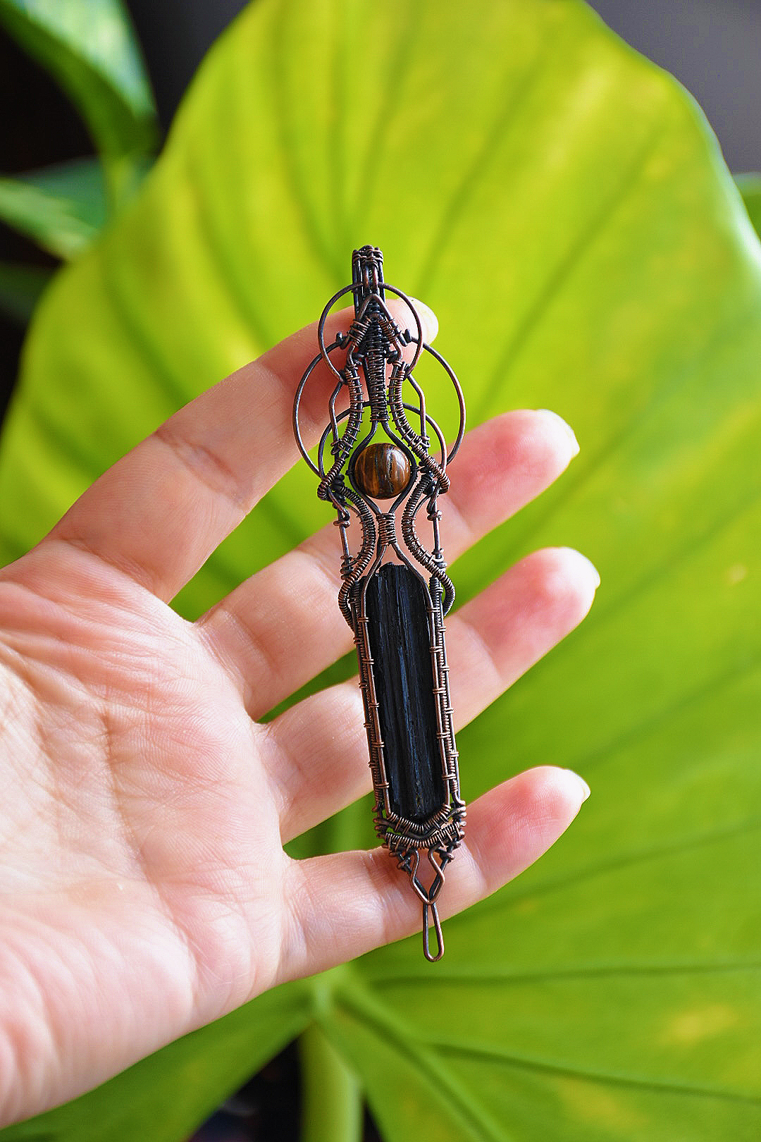 گردنبند ساخته شده با سنگ تورمالین سیاه و چشم ببر طبیعی و معدنی یک کار بسیار خاص و شیک ساخته شده تماما با هنر دست و فلز مس به همراه بند چرمی