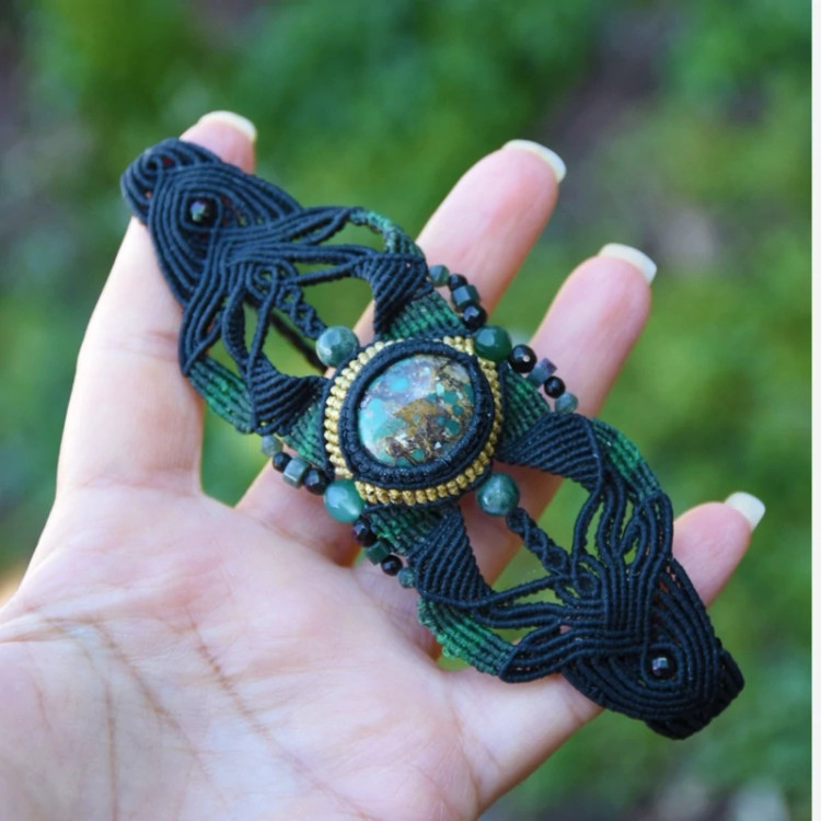دستبند بافته شده با نخ ابریشمی موم خورده فیروزه نیشابور سنگهای کنار کار عقیق معدنی میباشد