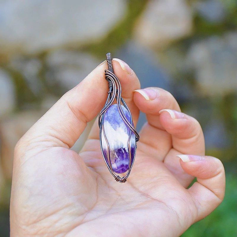 گردنبند سنگ آمیتیس ساخته شده با فلز مس تماما دستساز به همراه بند چرمی