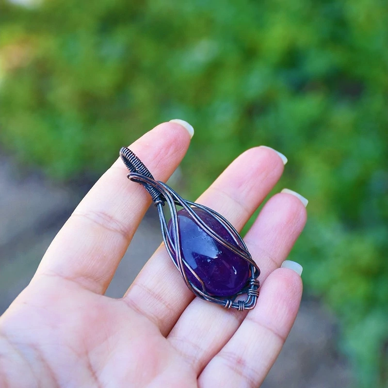 گردنبند تماما دستساز ساخته شده با سنگ آمیتیس برزیلی و فلز مس بسیار خاص و زیبا به همراه بند چرمی