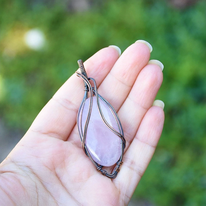 گردنبند سنگ رزکوارتز ساخته شده با فلز مس به همراه بند چرمی