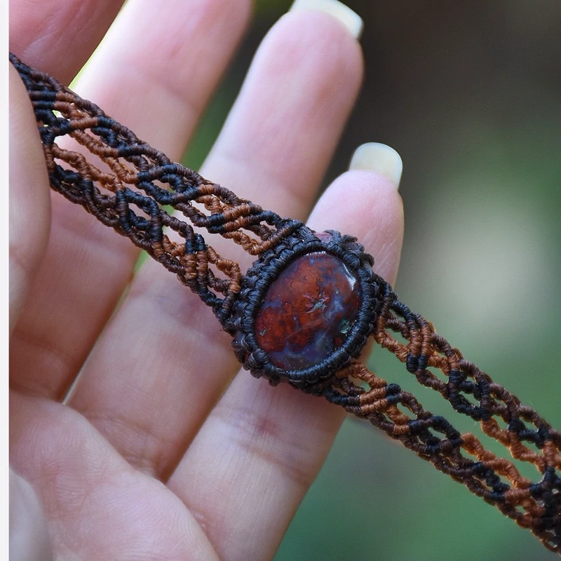 دستبند سنگ عقیق شجر بافته شده با نخ ابریشمی موم خورده با بند کشویی قابل تنظیم
