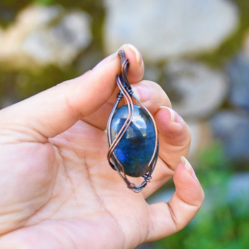 گردنبند ساخته شده با فلز مس و سنگ لابرادوریت آبی بسیار زیبا و خاص به همراه بند چرمی